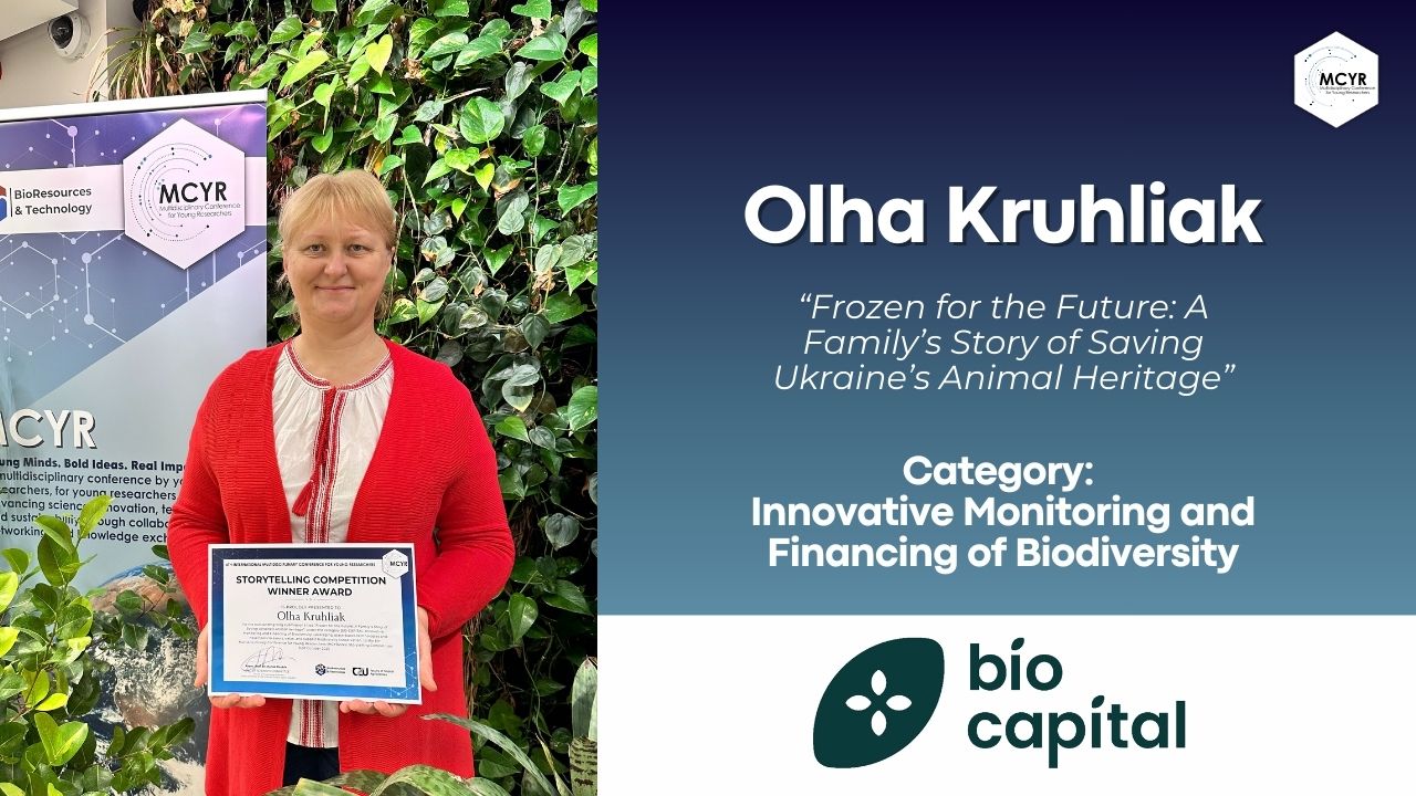In the category BIO-CAPITAL: Innovative Monitoring and Financing of Biodiversity, Olha Kruhliak from the Institute of Animal Breeding and Genetics nd. a. M.V.Zubets of National Academy of Agrarian Science of Ukraine was recognised for her exceptional submission, “Frozen for the Future: A Family’s Story of Saving Ukraine’s Animal Heritage.” Her moving narrative blends personal history with scientific innovation, showcasing how biobanking, monitoring tools, and novel conservation approaches can safeguard biodiversity for generations to come. The winning story embodies the spirit of BIO-CAPITAL by revealing how technological and financial innovations can protect ecosystems and preserve irreplaceable genetic heritage.